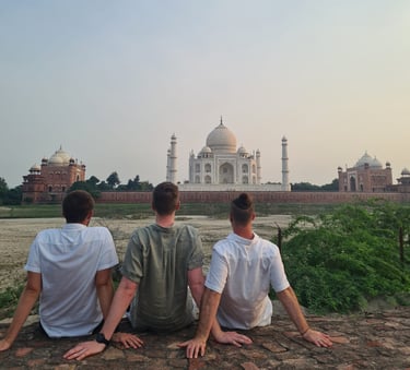 Once our bags are dropped and we’ve had a chance to freshen up we are back on the bus heading to Mehtab Bagh, otherwise known as the Moonlight Garden. Situated perfectly opposite the Taj Mahal on the other side of the Yamuna river. The garden was created as an integral part of the Taj and is the perfect viewing point for the Taj Mahal itself. It is a beautiful garden, serene and peaceful, the group obviously use the opportunity for lots and lots of photos. The site itself also plays a role in the myth of the Black Taj. There is a theory that this area, which is the exact same width as the complex of the Taj Mahal, was to be the site of a second monument created by Shah Jahan in black marble for himself to be buried in. Anuj, our guide, doesn’t talk about this myth; he recounts a version where the original monument, which is inspired by the Mini-Taj, also in Agra, and surprisingly built first, was supposed to be in black, but this wasn’t possible so white marble was used. The Garden was created as a viewing point for the Shah after he was imprisoned by his son in the Agra Red Fort and only able to see the reflection of the monument to his beloved second wife in the river. The Shah spent his final days sitting in the garden watching the sun rise and set over the monument.