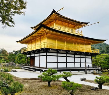 Once everyone has eaten and met up at the station, we are off to our next destination for the day: Kinkakuji (Golden Pavilion) in northern Kyoto. This World Heritage site designated as one of Kyoto’s 17 Historic Monuments of Ancient Kyoto is a three storey building with the top two stories covered in gold leaf making this building a vivid sight contrasting wonderfully with the beautiful wooded surroundings. This Buddhist Zen Temple was originally a villa owned by a wealthy statesman Saionji Kintsune before being bought from the Saionji family by shōgun Ashikaga Yoshimitsu to become part of his family’s estate. However, upon his death and at his request, his son turned it into the Zen Temple it is today. The only building in the estate to survive being burnt down during the Ōnin wars. Unfortunately the original building was burnt down by a novice monk in 1950 who then failed in attempting suicide and was imprisoned and then released at a later date due to mental illness. Although this pavilion has a fascinating history and, as mentioned, is visually rather stunning I do find myself getting more drawn into the silly games they have dotted around the walking path that you can play. My favourite being a deceptively hard game: a pot in the ground a meter or two from the barrier into which you are supposed to throw coins – a successful throw means good luck! So with my luck being what it is I go through all my coins and for three shots in a row my coin goes into and then bounces straight back out of the pot! So, having spent all my change, I continue my walk finishing at a load of vending machines full of snacks and drinks I would like to indulge in but now can’t because all my coins are in a pot or more accurately laying around a pot back down the trail.