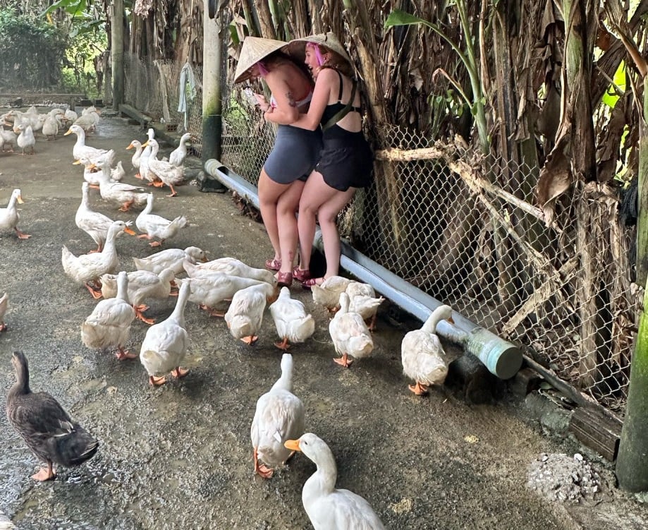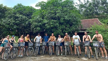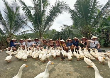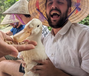 Our next stop is a duck sanctuary; not something one would necessarily associate with a trip round SEA, but a lot of fun anyway. We are asked to change shoes and are given traditional style farmer hats before being taken into the duck pen. There are quite a lot of ducks here, like more than I was expecting and we get to feed them. However we are supposed to do it in a specific way. We take turns in the feeding, leading the ducks around the enclosure, and then taking a handful of feed throwing it in the air, to get the ducks to all look up, and then bringing our hand down in synchronisation with all the food hitting the floor and the ducks getting stuck in. It is rather weird, we then end this ritual by throwing feed at the rest of the groups feet, followed by the group panicking as a horde of ducks quickly waddles over to them pecking at the feed at their feet and even the feed that has gotten into the crocs we are wearing. Zara and Elaine especially struggled with this part! We were even given the chance to hold one of these lovely birds, although we did realise that after having them on our laps many of us were then covered in duck shit but, hey, guess that’s the price you pay for cuteness! Afterwards some of us took it in turns to ride a water buffalo and get some questionable photos! Then we biked our way back to the hostel in time for dinner, passing an ornate cemetery on the way.