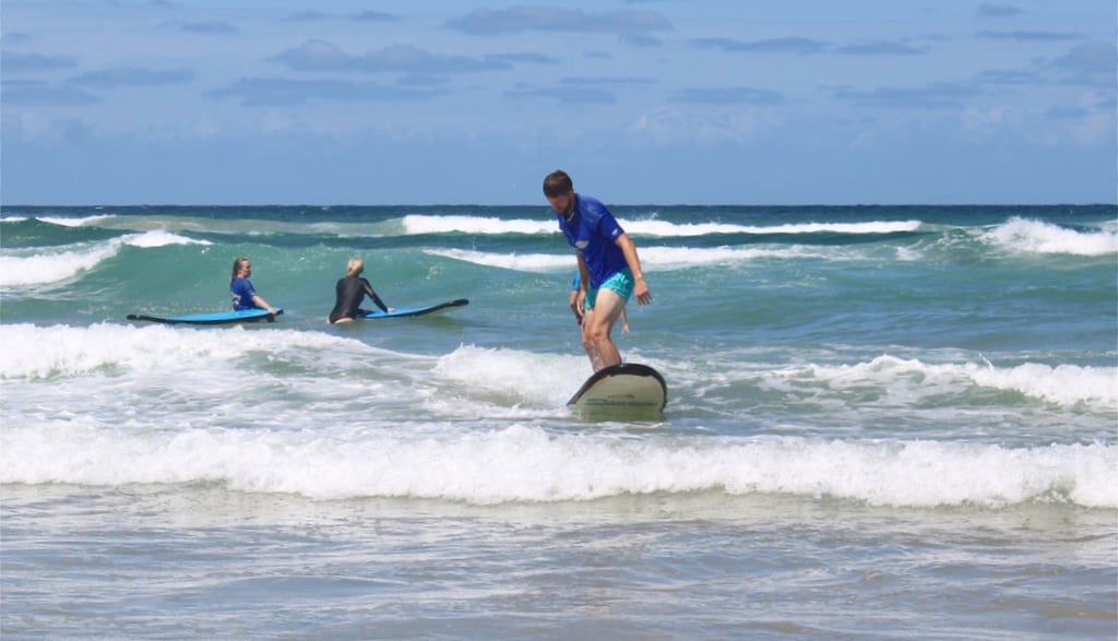 Mollie isn’t surfing but does the group a solid and uses Karoline’s camera and gets some great snaps of us all. Good thing about a static photo while surfing: you only have to be standing for the split second the photo is taken and it looks like you know what you are doing! Although, having said that, on review of the photos there are definitely more of us mid fall than mid surf. This is especially the case when it comes to Matt, a new friend who, due to his dual nationality, proposed to me and everyone else in the group, just in case any of us needed citizenship. For now, unfortunately, I am sticking with the work holiday visa, but who knows Matt is a good looking lad so we shall see.