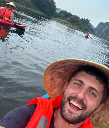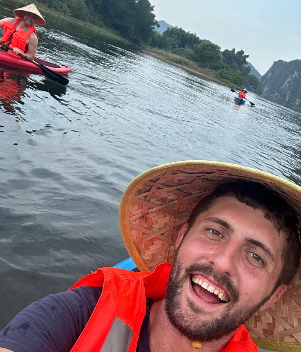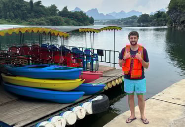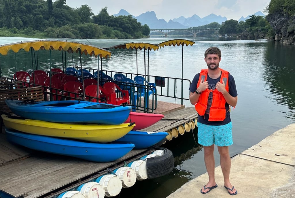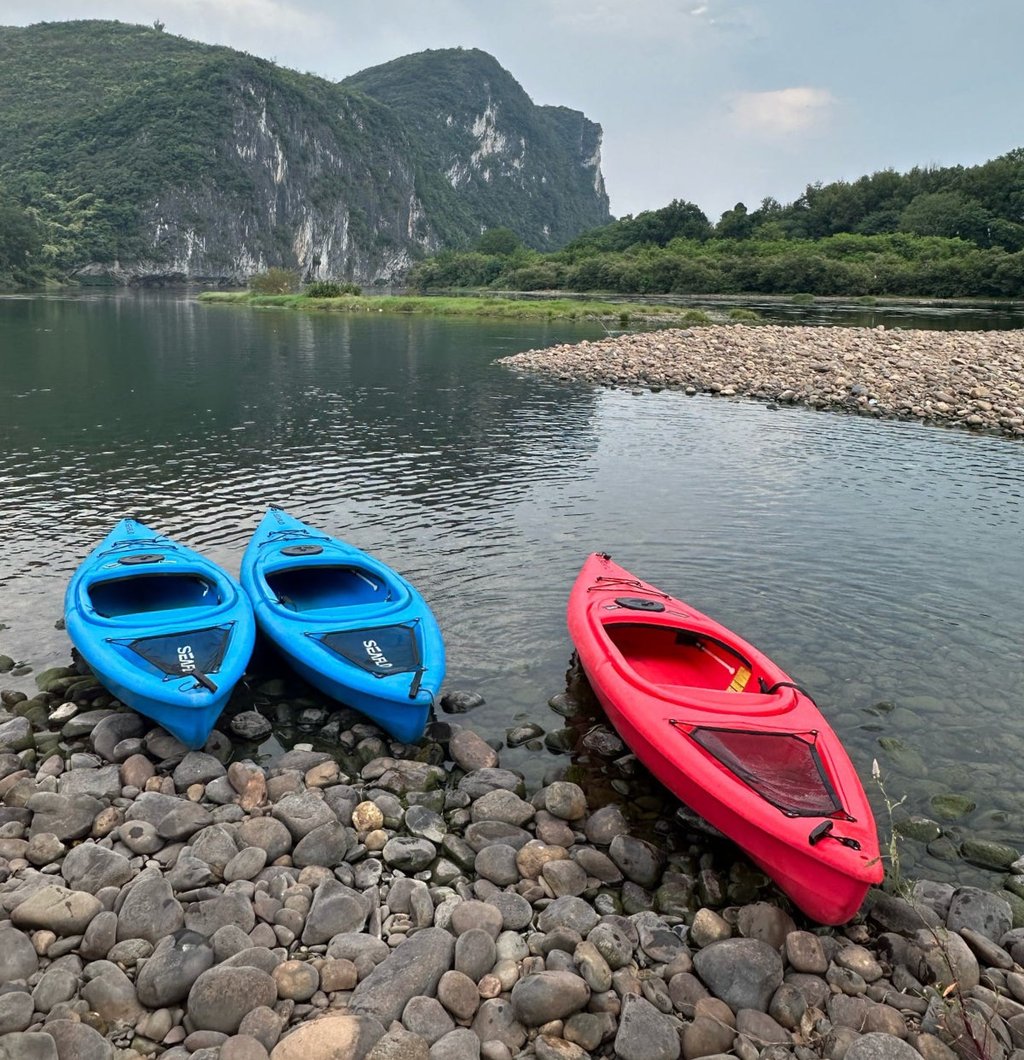 After the cooking Erika, Tom and I were dropped back at our hostel with just enough time to change before we headed out for our second activity of the day. Kayaking. For this activity Ping was joining us, unlike with the cooking this morning. The group was picked up and driven to the Li river where we put on our life jackets and loaded our kayaks onto a bamboo boat to be taken up stream. The plan today is not a race and no rapids, just a gentle, calm drift down current taking in the beautiful scenery around. It does not disappoint; once in our kayaks we take off, gently making our way down river. The group take turns taking photos of each other as we gently row our way past rolling hills, trees and greenery as far as the eye can see, as well as the occasional fisherman on the bank. The trip ends with us passing our starting point to row under a nearby bridge. We do a turn around the bridge and row up stream back to the dock and all somewhat struggle to get out of the kayaks and back on to dry land.