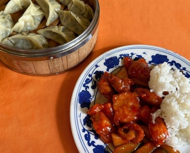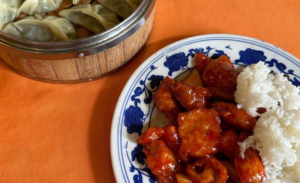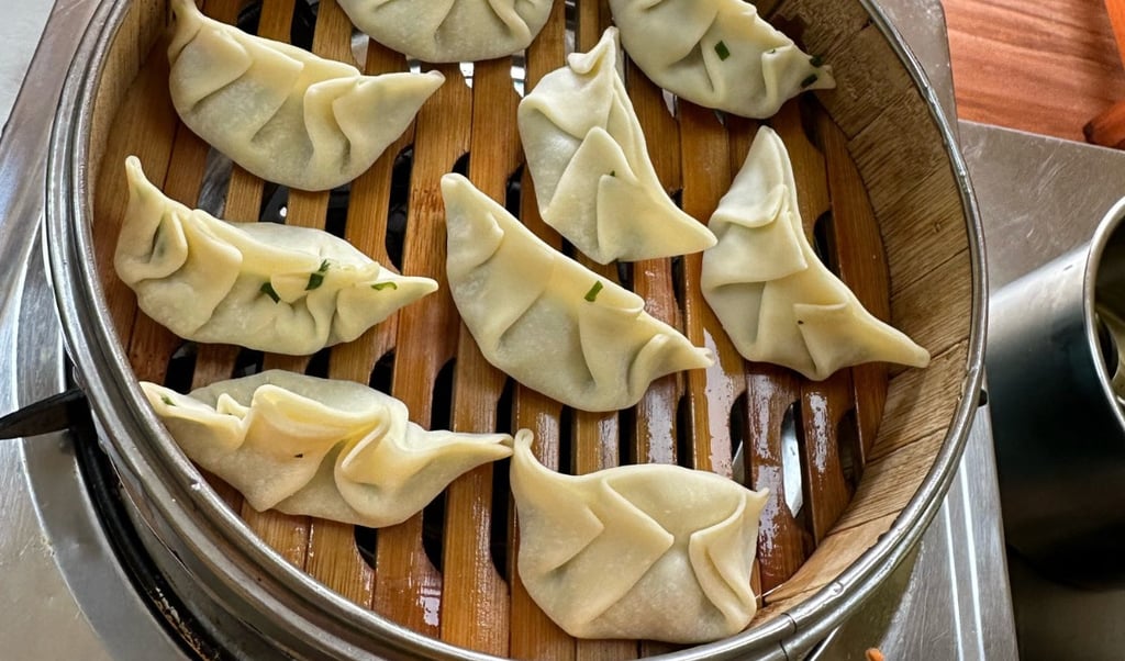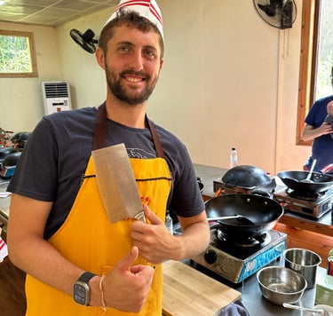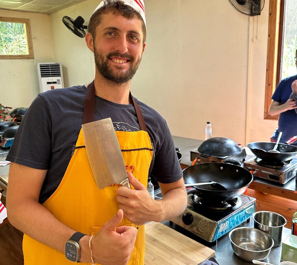 After the market we are driven to the cooking school slightly out of town. The group walk in and are taken into the kitchen. We each have out own station. In front of us is a gas hob on top of which sits a wok, a chopping board and cleaver as well as an assortment of sauces, oils and some fresh ingredients we didn’t buy in the market. In the market the group got some choice over what we could cook – two meat dishes and two vegetable dishes. I personally jumped at the opportunity to learn to make dumplings properly, I usually buy mine frozen, so that was one of the vegetable dishes down. The other Tom like the sound of noodles, I did too, it was the most filling of the options given, so that was the second vegetable dish chosen. For meat the group chose sweet and sour pork as well as beef and mushroom. Well, in fact, we said sweet and sour chicken but once at the butchers our teacher ordered a nice slab of pork, which, to be honest, I was rather happy about, do love some pork.
