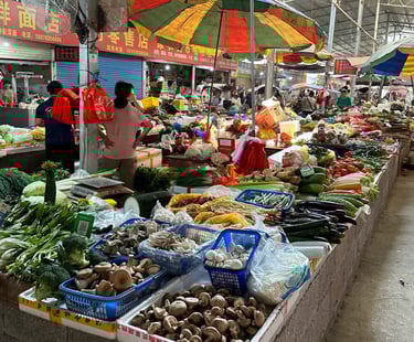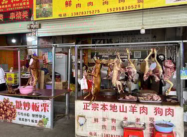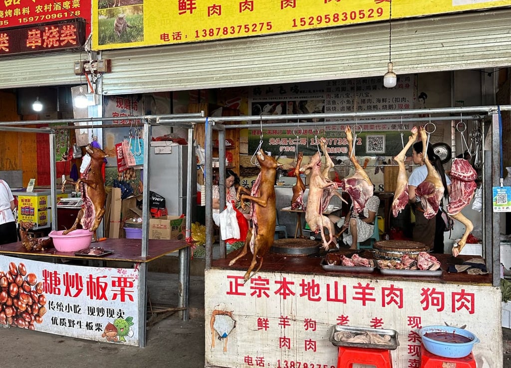 Today I woke up refreshed and excited; not only did I manage to catch up on some sleep but it was time for my next cooking class. I love food and I love cooking so I unsurprisingly love a cooking class. It starts with us being driven to a local market to meet our instructor. Tom, Erika and I are joined by two others who we find out later are at the end of their trip in China, they have loved it. As a group we walk around the market taking in all the sight and sounds – some more surprising than others. You have your usual fruit and veg stalls but towards the end we get to the fish stalls; here I see sights that for China are nothing special but for me rather different: tanks full of crabs, eels, fish and a variety of different clams, molluscs and other sea food – all alive, sold to butchered at home. Then venturing deeper still we see sights that many wouldn’t want to see. Along side the pork and beef in the butcher shops is rabbit, cat and dog. Now I am not one to judge and have no issue with the different food cultures that countries have but I have to admit the idea of cat and dog does feel a little weird, although I have eaten and very much enjoy rabbit.