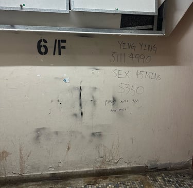 My taxi drops me off and I have an absolute nightmare. It takes me about 15 minutes to find my accommodation. You see, at the start of each trip, when arriving early I have just paid for an extra few nights at whatever accommodation my tour was starting in, but here I had booked my own place and I went for cheap and nearby. The picture the Alhambra Bed & Breakfast had uploaded as a guide was of the back of the building, down an alley that is off the main road. This was exasperated by the fact the address on Google and Apple Maps say it's on the other side of the street. Anyway I finally figure it out and arrive, sweating in the newly-risen Hong Kong sun, to find that the lift is broken. So with my bags I trudge up seven flights of stairs to the reception, in what is not a hostel or bed and breakfast but a shitty apartment block in which someone has converted a couple of rooms to overcharge tourists that don’t know better. In the stairwell I am greeted by what every tired and, lets be honest, slightly spoilt and likes-his-home-comforts type of traveller wants to see, hand written signs on every floor asking people not to defecate, and graffiti advertising cheap sex. To be honest the building is so dirty and disgusting with litter, cigarettes and dirt everywhere I can’t help but imagine that some defecation might spruce the place up a bit.