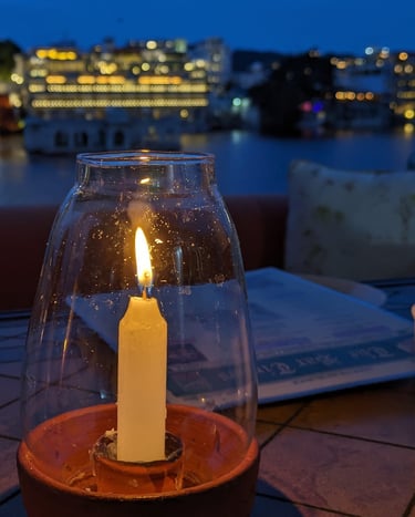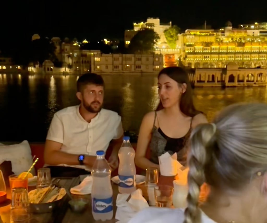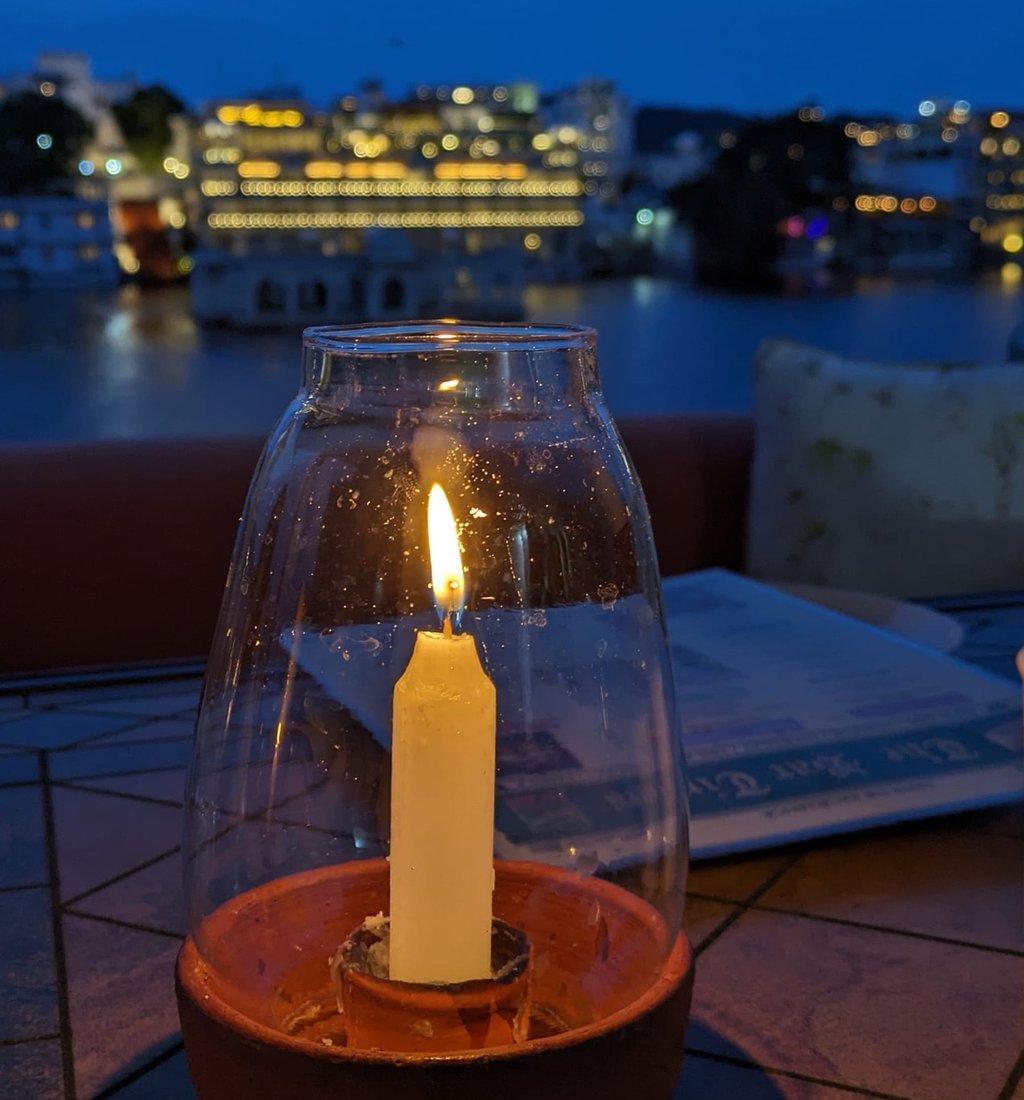 Once on the boat we are all handed extremely bright life jackets with the explanation that Australian insurance, One Life is a Australian registered company, is very restrictive and life jackets are a must. The boat is the slowest form of transport I have ever been on, not helped by how overcast it is, turning this sunset cruise into just a cruise. Luckily for us the city itself is beautiful and once the sun is set, the way the many hotels, restaurants and city in general light up is beautiful. We take lots of photos while Anuj fills us in on the history of many of places we pass. One of which is Taj Lake Palace or Jag Niwas water palace, now a five star hotel and famous wedding destination. Will and I are particularly fascinated by one building, where only a helipad is all that remains above water, Anuj tells us that underwater is a full hotel that emerges during dry season. That seems crazy to me but agree with Will that it would make a cool diving/snorkelling sight.