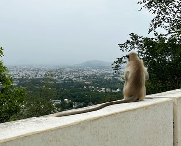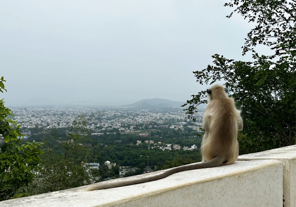 Once we are up at the viewpoint I actually see this couple again and have to say the woman gives it as good as she gets it, so maybe just an unhealthy relationship on both parts for them and not an indication of the bad treatment of women in general. The views here are amazing, Udaipur is a beautiful city with lakes in the middle. We are joined by monkeys at the top of the mountain.The group is amazed by the length of their tails – it’s crazy! Once we have soaked in the views and made the most of the photo op, we head back down on the gondola and call for our driver who zips us back to our hotel. We have a little time before we are meeting up so I head out again, this time determined to find a laundrette. I wend down different roads all leading to or from the intersection that Google claims has two laundrettes, all to no avail. I have a sneaking suspicion the laundrettes aren’t open today as there are quite a few shop fronts with their shutters down. In a last ditch attempt I ask a couple of guys in the tailors on the road the hotel is on and they tell me that, although there is normally a laundrette here, it is not open today. My heart sinks – I have about one clean outfit left. Here’s hoping the hotel in the next place doesn’t charge too much for laundry.