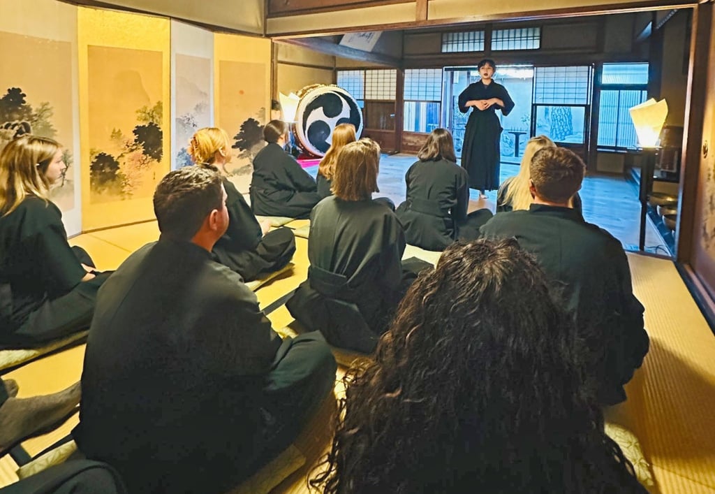 After a break at the hostel it is time for the moment we have all been waiting for, Samurai School!!! A quick journey later we arrive in an old school home with a weird layout and once we are donned with traditional samurai attire, we take our seats to learn not only the history of samurai in Japan but the history of the very house we are sitting in. A rarity these days, this traditional samurai house holds many secrets, from a narrow front door to make intruders enter single file, low beams to stop overhead sword swings and even a secret passage. The owner, a Samurai and political official, was around when the rule of the samurai came to an end adding to the rarity of this house. The only reason it still exists is because of his royal wife, weirdly, he was married into the royal family, a real Romeo Juliet love story. The reason we know this is due to the royal family seal that can be seen in those low level beams I mentioned earlier, so we can surmise that this samurai’s wife was able to pull some strings to allow him to, not only live, but keep his central Kyoto home and position. Following this lesson about the home and samurai culture in general, it is time for some demonstrations. The first inside the home accompanied with traditional gong music that has an incredibly calming effect is juxtaposed to the speed and lethal efficiency of the swift and smooth swings and slices of the samurai’s sword. In a matter of seconds the two rolled up tatami mats representing two invading intruders are sliced in half. An impressive display at all times but the fact that moments before we had been told to not cross the doorway with our phones as the average samurai with a good swing can easily take off an arm at the shoulder. Almost as if to prove this point the next demonstration is another samurai making light work of slicing five thick tatami mats carefully wrapped and bound together – it is an impressive display.