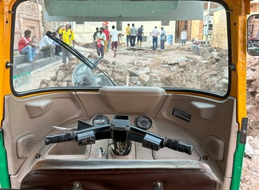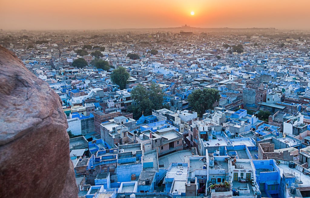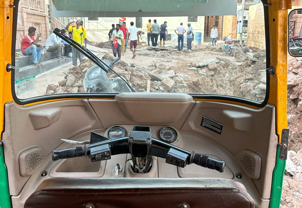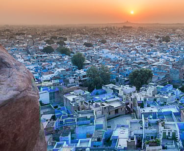 We arrive at our destination, Jodhpur. Jodhpur is the second-largest city in Rajasthan, set in the stark Thar Desert. It was historically the capital of the Kingdom of Marwar, which is now part of Rajasthan. It is known as the ‘Blue City’ among the people of Rajasthan. We head to the tuk-tuk rank and load ourselves into three rickshaws. Our drivers seem especially crazy on this ride. We go speeding in and out of traffic over bumpy, windy roads. One of the drivers seems to love smashing down on his horn an enormous amount, even by Indian standards. At one point we reach a road that is dug up for water works and our drivers try and get us to get out and walk the rest of the way. Anuj is having none of it and insists they go round the block to drop us of outside the hotel. Our hotel is in the centre of this marvellous walled blue city. Once we arrive we check out the pool which we all agree is probably worth avoiding and then up to the roof. It is an amazing view a full 360 view around the city, we can see the Old Fort, City walls, temples and so much more.