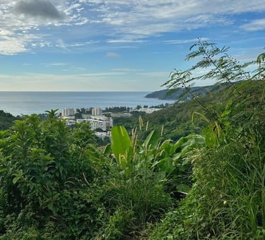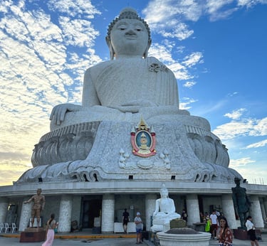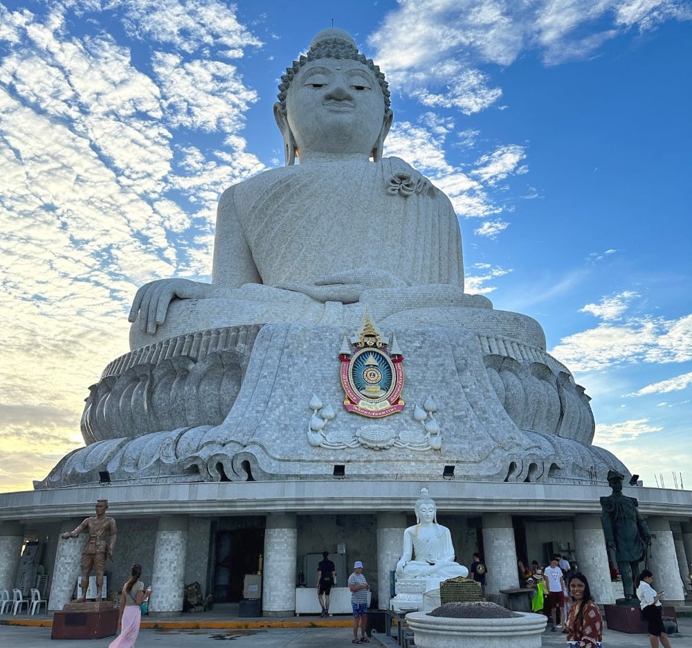Even though I am in the single bed I manage to have another lie in and, same as yesterday, Alex and I decide to start our day at the Sandwich Box. I have another egg drop and tea but this time I add a honey lime soda which is also sublime. Once again we are slowly joined by Jon and Scott, those two do love to sleep. After we head to the beach for some sunbathing and a dip in the sea. It is a nice area Karon Beach but clearly a big holiday destination for Russians. Every other person I see seems to be a Russian family on holiday, not that this is an issue, it just means it is a little touristy around here. The boys and I decide today would be a good day to go see the Phuket Big Buddha, Phra Phutta Ming Mongkol Eknakiri, a local statue on the top of Nakkerd Hill which has become a bit of a tourist attraction due to its rather large size. We decide to hike up to it though, rather than take a taxi as it is only about an hour or so journey and we all agree it would be good to do some exercise. However, about half way up I think we all start to rethink our decision; it is sweltering even if the hike is in the shade, and for some reason I am the only one that has brought any water and we are in need. Jon, Alex and I stop and wait for Scott to catch up at one point and realise we are getting absolutely swarmed by mossies so continue on until we are out of the forest and luckily find a restaurant with cold water. We patiently wait for Scott. After what feels like an eternity he finally joins us and he isn’t looking so good, this kid’s definitely got heat stroke so we give him the water we have bought and take a breather before carrying on up the road for the final part of the hike.