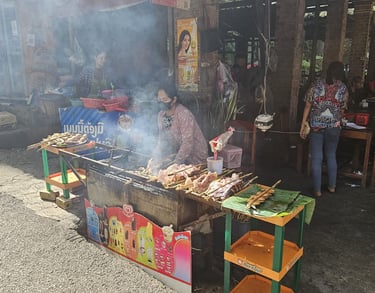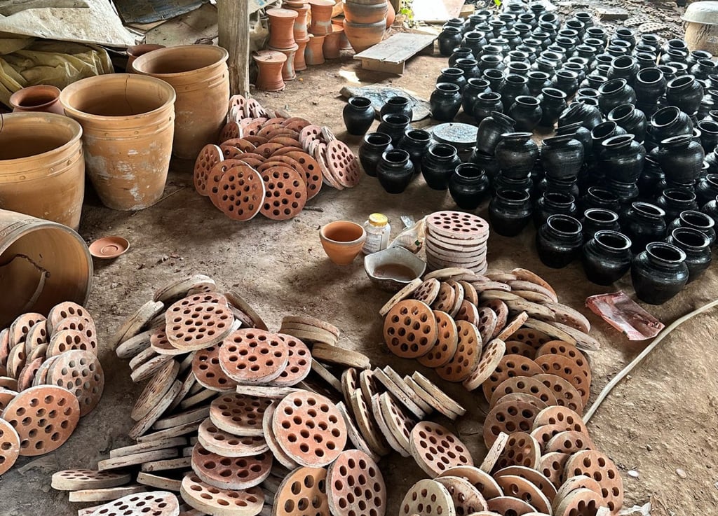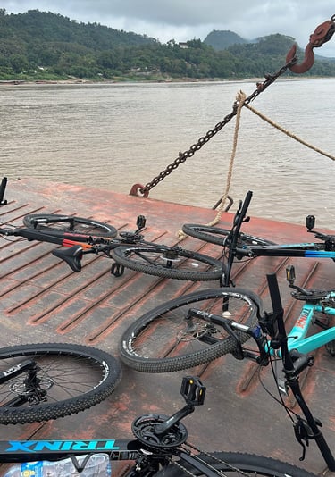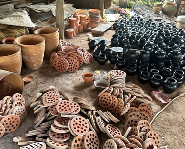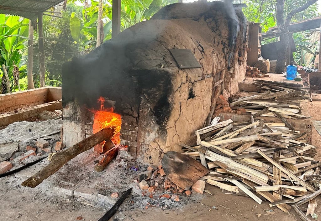 The next day was a fairly early rise by my standards: 8am, but I didn’t mind today, the boys and I had opted for the bike tour. No one else in our group wanted to do it so we had to pay a little extra but it was a bike tour by Neng. We cycled through Luang Prabang, down to the Mekong river before loading onto a ferry to cross over and then cycle for two and half miles (I initially struggle up the hill) before reaching Ban Chanh, the pottery village. Once there we request a quick stop for tea and coffee before beginning our tour of the pottery village. The village itself became a pottery village when a french man set up a massive communal kiln and work station for the village which is divided into groups of people who take turns using the area. The villagers then keep 70% of the profit from the variety of things they make, from massive pots to little figurines. It is hard work with people having to man the fires for days at a time and for what is better than before, but still little pay. Annoyingly when we get there it is a holiday so although a family is working the kiln the area isn’t really up and running. Luckily for us an older gentlemen offers to give us a demonstration of some the work they do there.