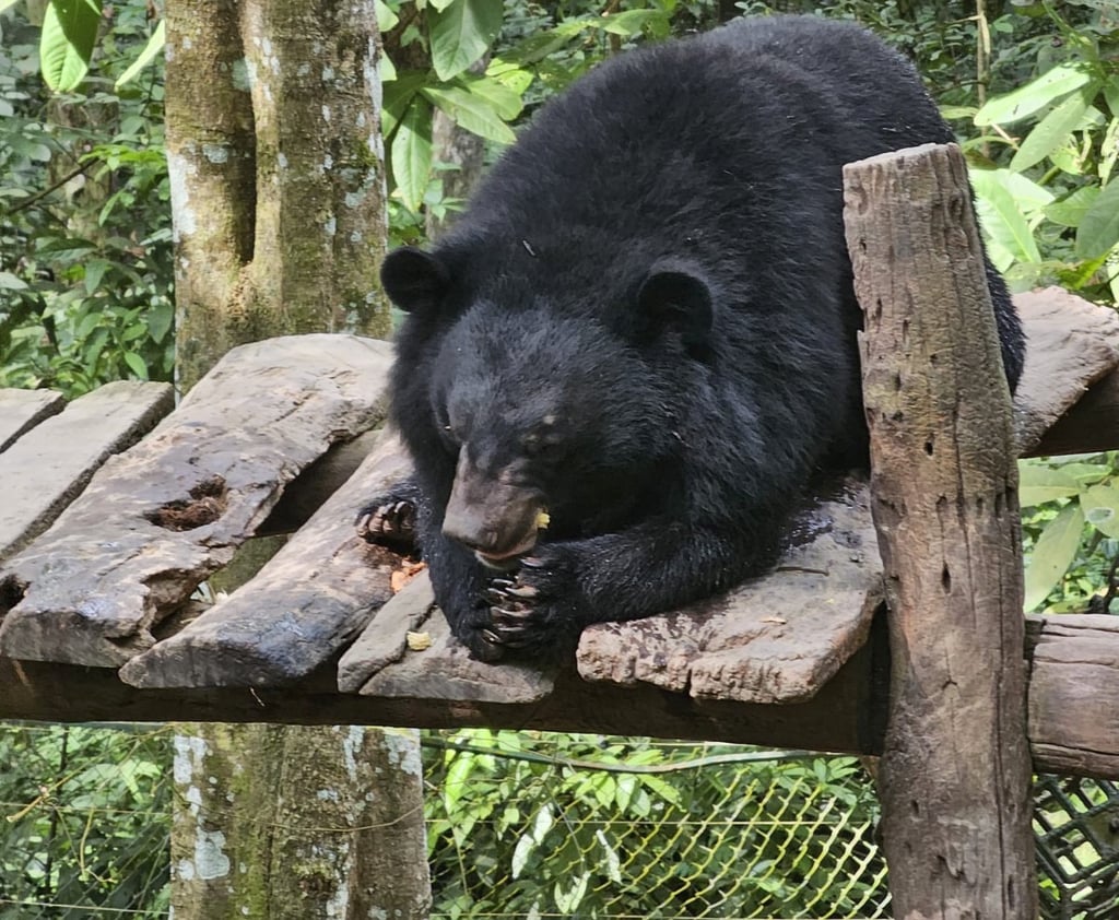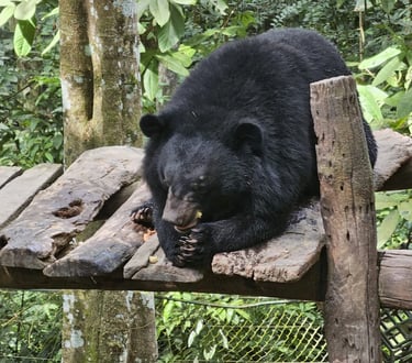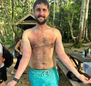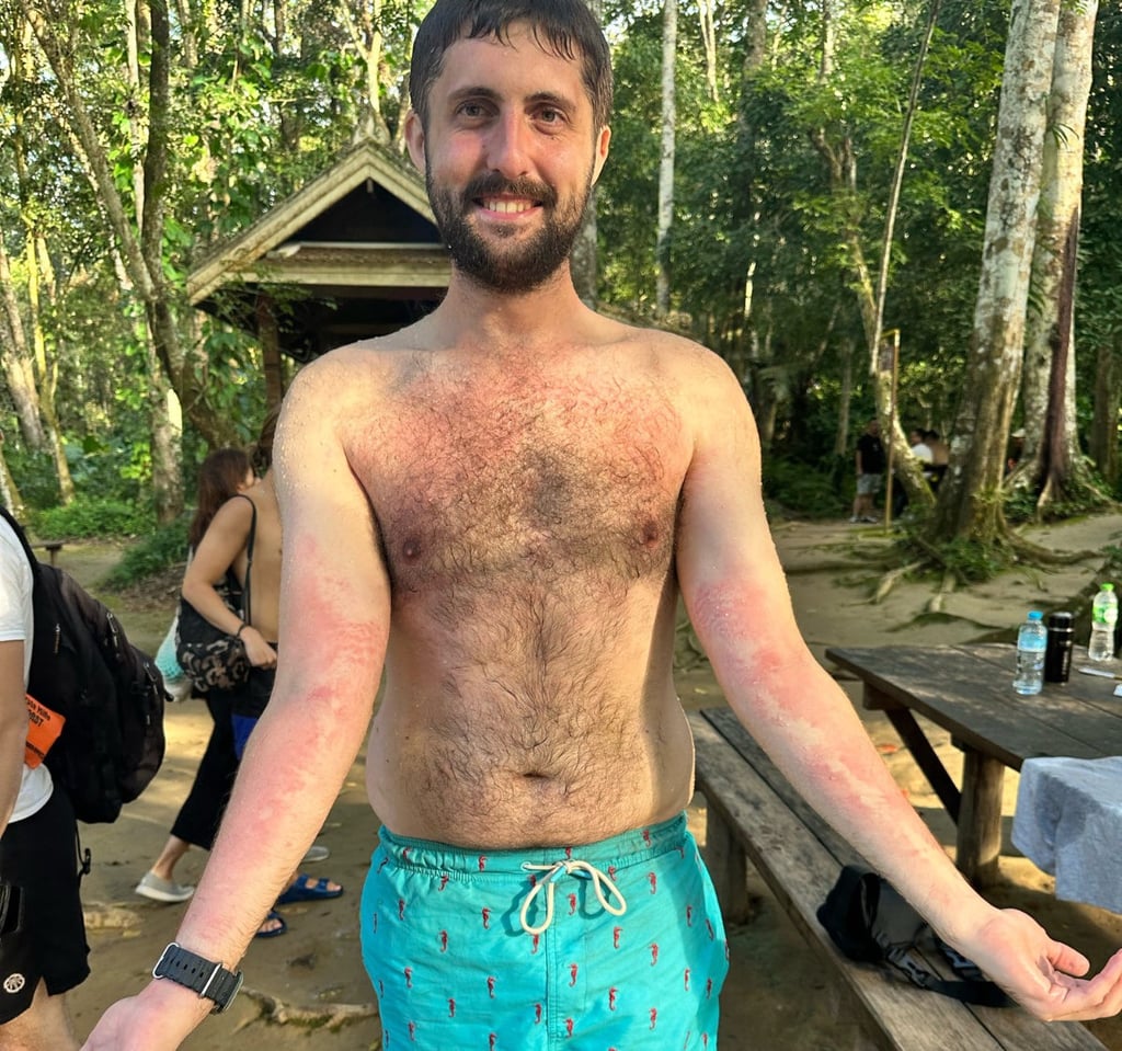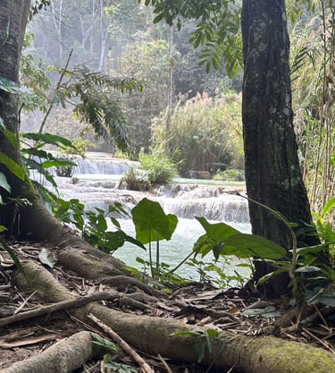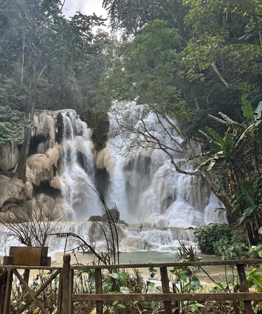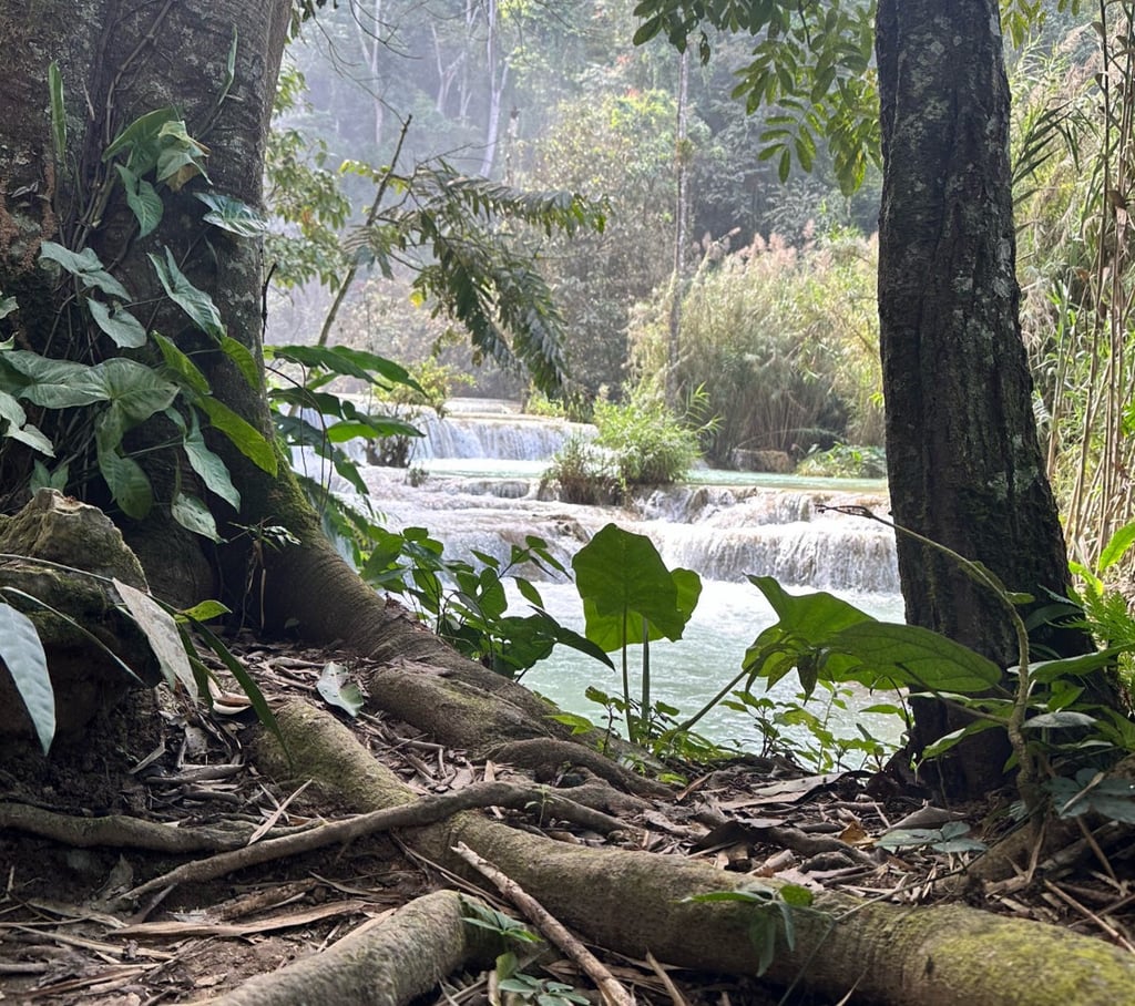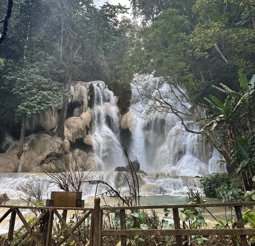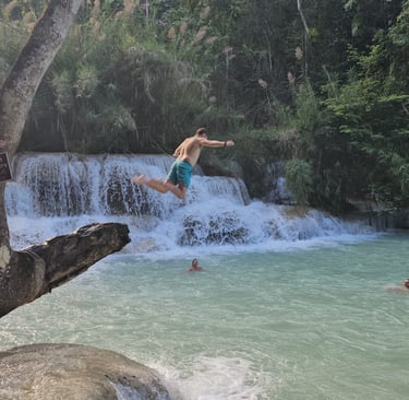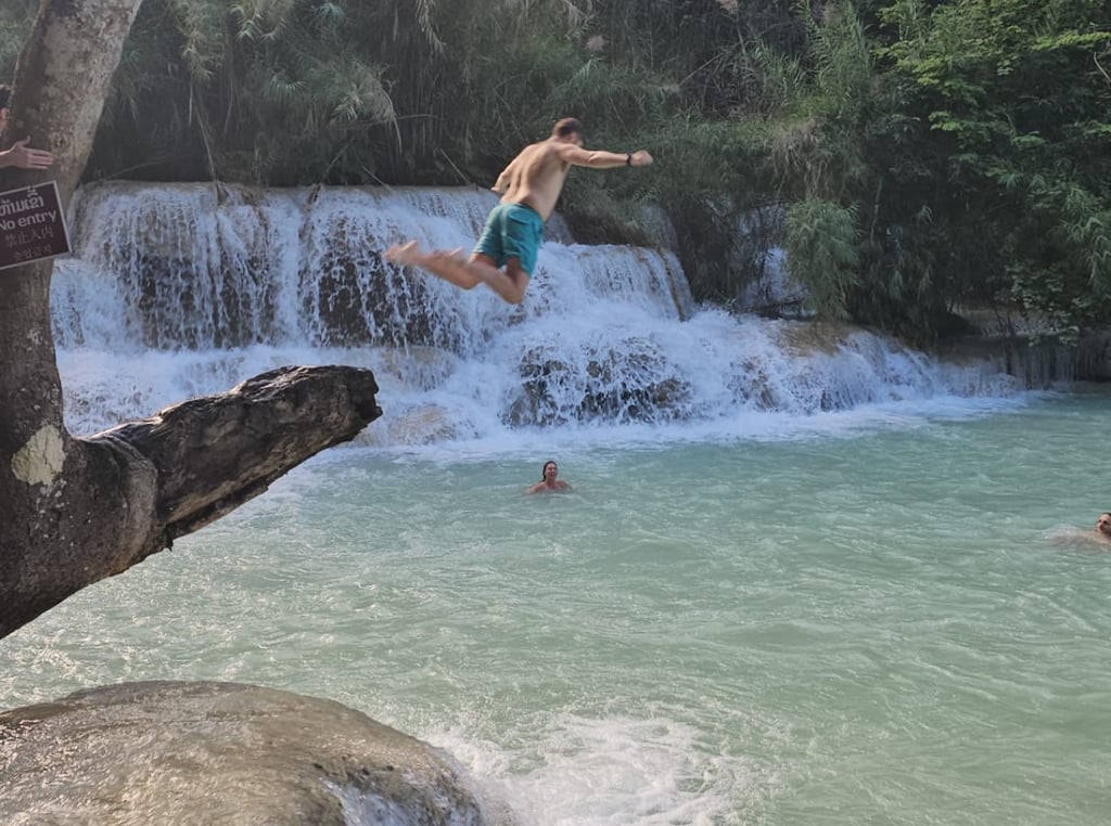 Once we are back from our biking and the others are back from their activities the group make our way to the Kuang Si Waterfall, on the Kuang Si river, a small tributary of the mighty Mekong, which is over 3,000 miles long. Now this is a real waterfall. A beautiful area with three different levels you can swim in. On our way up we even pass a bear sanctuary. The top pool has lovely water to swim in and is gorgeous on a hot day. There is also a bunch of young monks in training enjoying the water, which is nice to see. At one of the levels we find a tree to dive/jump off so, Alex being Alex, challenges me to a belly flop contest and, me being me, accepts. I come out of the water red, like really red but luckily the sting isn’t too bad! After we are all done at the waterfall the group heads back to the hostel to chill and play some games of pool on the roof before dinner.