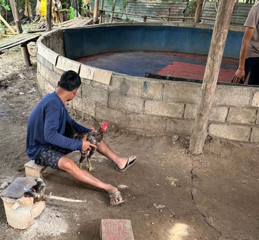 After we have seen and learnt about all the pottery, we happen to come across a roadside cockfighting ring which we ask Neng if we can see, out of some sort of morbid curiosity. It was amazing to see that they really care for their cocks, bathing them before and after every fight with real devotion They also tape down the back claw of the cocks which is how, in the wild, they would deliver the death blow. Lots of money is bet by the locals on the fight we watch, which ends when one of the owners throws in the red towel, worried that his fighter is becoming tired and injured. Neng tells us it will be months before the cock fights again, with all the fighting cocks being treated like prize possessions by their owners. Still, it is not the easiest thing to watch, but fascinating.