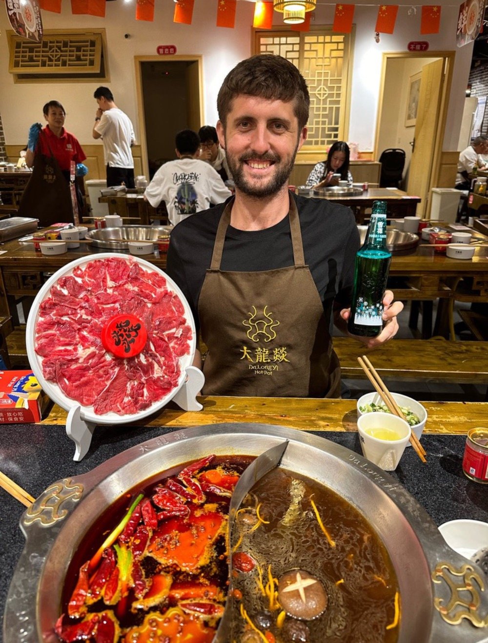 Once we are all religioused out we jump back on the metro to our hostel for a quick freshen up for what I have been looking forward to all day – the world famous Sichuan Hotpot. A shared meal in which those partaking sit around a table with a pot full of boiling soup with a fire underneath. We order a pot with a spicy and none spicy side, although I have to say so far I have been finding the spice levels in China rather lacking. With the pot in place we also order a plate of raw meat each and an array of different uncooked vegetables to be individually dunked into the soup and cooked before consumption. The meal is pleasant although, once again, the spice levels aren’t where I would like them to be. It is a meal that follows an eating pattern I am starting to notice in China. Unlike in England and other countries where one orders a single plate with a variety of things on it for themselves, here people order plates full of different singular elements and then all share. I personally am not the biggest fan of this style of eating as for someone who likes to eat a lot and personally enjoys the blends of different ingredients together I tend to find the meals leaving me still hungry and slightly unsatisfied. Still it is a fun experience and the bits I did manage to eat, I enjoyed, although I did struggle with the chopsticks over the boiling soup. After the meal we ended today similar to yesterday a game of cards on the roof before a relatively early night. After all I am still rather sleepy.