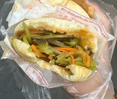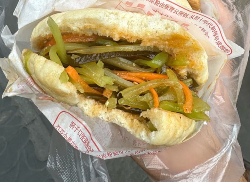 Having skipped the tea garden, we head out of the monastery in search of lunch. We stop at a local take away to get some rolls referred to as Chinese burgers, although I would draw more similarity to a pitta bread. Inside we have one with pork slices and another with a vegetable mixture which I, weirdly for me, enjoy more than the meat one due to its pickled and spicy nature.