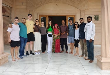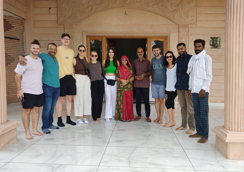 We have an extra special stop today, although not on the itinerary, Nik our trainee guide has offered to have the group visit his family home. A beautiful array of land owned by his close and extended family, growing different crops and raising cows for milk – it is lovely. The family has recently built a new house connected to their old one. Although incomplete and without electricity it is still a sight to behold. It is a nice break from the hustle and bustle of the cities that we have gotten used to. Nikihil is native to Rajasthan and his family comes from an ancient warrior caste known for their hospitality and his family lives up to this trait, opening their home to us and offering us amazing Chai and tasty snacks. We also get to meet Nik’s dogs. However, at a distant, these German Shepard, Great Dane mix breeds are behemoths and not welcoming to strangers! Their bark is enough to send shivers down your spine, although they look like they would be great to hug once they got to know you!