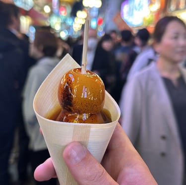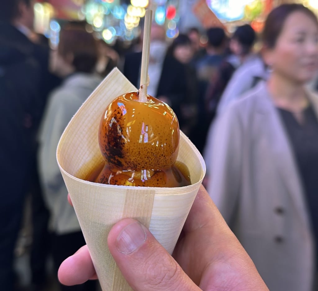 From the castle we all slowly started to make our way to the meet-up point, enjoying the last of the day’s sun. Once we had all reconvened we got back on the metro and made our way back to the busy city streets. Our destination was a food street along the Dotonbori river. This fabulous street is famous for having many many different restaurants and street cart vendors selling a wide range of delicacies. Me and a few of the others decide to take advantage of our proximity to Kobe and get some Kobe steak. Now I can’t afford a whole steak but luckily there was a local restaurant where you could order an almost tasting platter of four different cuts of Kobe steak on rice; kind of like Sushi – the meat cooked by a singing chef with a blow torch – it was amazing! Later though Sarah, Lucinda and I try a Wagyu skewer between us and we all agree it was better than the Kobe, the steak cubes melted in your mouth and tasted amazing. Later Rebecca and Natalie get octopus balls and are kind enough to let me try one. I do not like them the shredded dried fish flakes on top are entirely too much fish for me! Even though I have to chug water instantly to get the taste away, I still have a better experience than Rebecca has with her first bite. In her eagerness she scoops a ball into her mouth not realising the molten hot creamy inside needs time to cool, she instantly panics and struggles to find somewhere to spit it out, her mouth burning until she finally is able to get rid of it. It was an equally terrifying and hilarious thing to watch. As Lucinda, Sarah and I wander down the rest of the street I also try a pork and kimchi battered skewer and for dessert a sticky rice ball covered in a soy sauce glaze which is just a little too much for me and I am unable to finish all three balls.