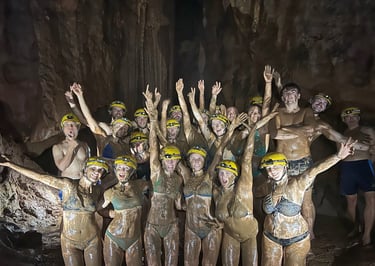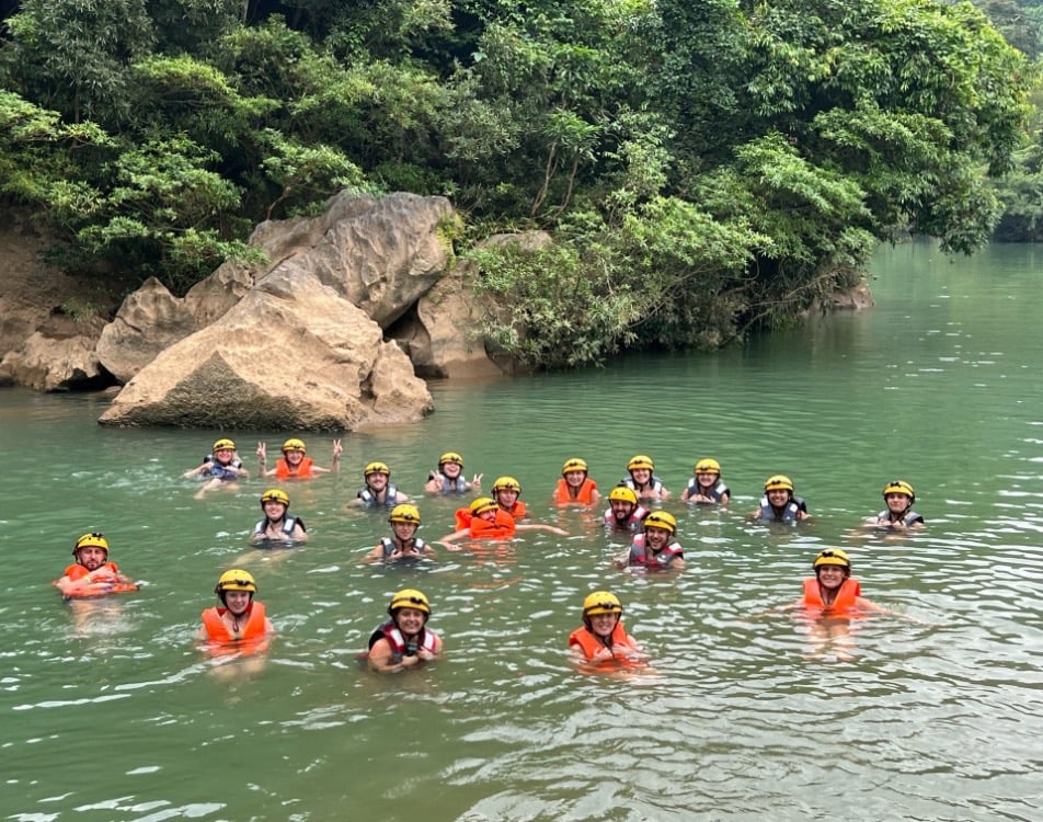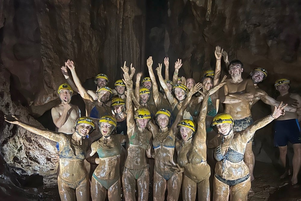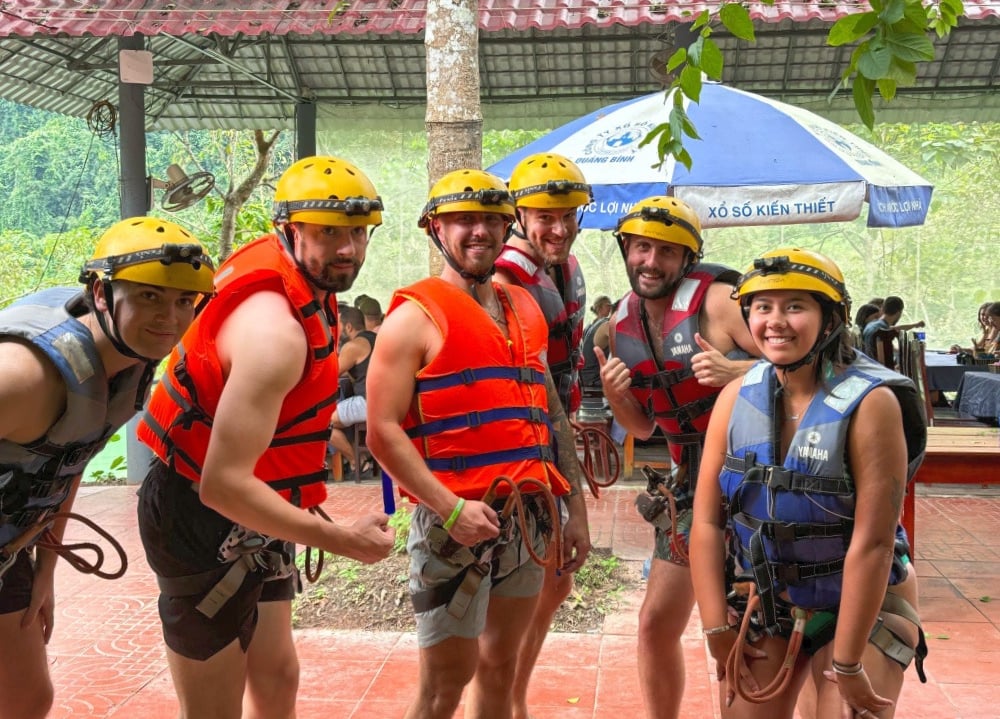 Now it is time to head to the Dark Cave, the entrance to which is across a river so on with our annoying, but apparently mandatory, life jackets and up to a zip line we go. One by one we take it in turns to make the jump and zip across the river to the other side. Once there we have to jump back in the river and swim to the entrance of the cave. Poor Viet freezes in the water, even if for me and the others it is a much welcomed refreshing experience. We make our way into the cave which requires a mixture of walking, climbing and swimming to get into the core of it. Walking is actually the hardest part due to how muddy the floor is from the mixture of dirt, clay and damp. Once fully in the cave the group enjoys a not-so-relaxing mud bath. Not so relaxing because, of course, a mud fight has been brewing since we first entered the caves, with the occasional mud ball being flung back and forth from the very start. I will admit to maybe throwing one or two myself during this time. Although not so relaxing, I do have to admit in my limited but fun experiences with mud baths, I do find they leave your skin feeling lovely afterwards. After the mud bath we make our way back out using the swimming parts of the journey to wash ourselves off. Once out of the cave we have kayakers to get us back over to the other side of the river. I decide to swim part of the way wanting to have a proper dip after all the mud. The group finds a mini water park waiting for us on the other side. This is potentially the funnest part of the day, as it comprised of a mini zip line that ends by flinging you off the handles into the water, plus a slide, water trampoline and a floating banana boat type thing. There is also a floating walkway with the goal to get across before sinking – I am rubbish at it! We have a lot of fun with Alex and Lars even having one of their increasingly common and increasingly homo-erotic wrestling matches on the trampoline which was not easy to get onto without help.