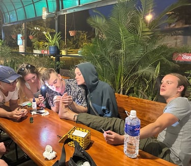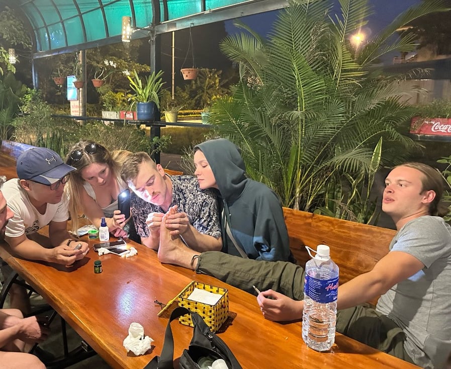 Once we are all knackered from the fun, it is time to dry off and get back on the bus to the hostel. We checked out earlier before we left and are now just hanging about waiting for our night bus to come pick us up from the hostel. We have a couple hours to kill, so most of us get dinner at the hostel. During one of the games of pool I play with Viet we notice some of the group on one of the outside tables acting a little weird. Louis is lying back and people are shining torches at his foot while everyone seems to be staring at it. Viet and me take a closer look and stumble upon what I can only describe as a make shift clinic with Lars and Charlotte digging away at Louis’ foot trying to get a splinter out. It is a rather horrific thing to watch but also one of those things you can’t look away from. After what seemed like an age, Lars finally was able to extract one of the smallest splinters I have ever seen that according to Louis was the cause of such a pain that the make shift surgery was worth it. Finally the night bus arrived and we were off. The workers and drivers on this bus were less than helpful with even Viet, who so far has seemed nothing but lovely, calling them dicks! However, the journey isn’t a full night so we only have to deal with them until 1am when we arrive into our next hostel in Hoi An. We check in and get into some real beds for some much needed rest after a rather fun filled but tiring day and not so relaxing bus journey.