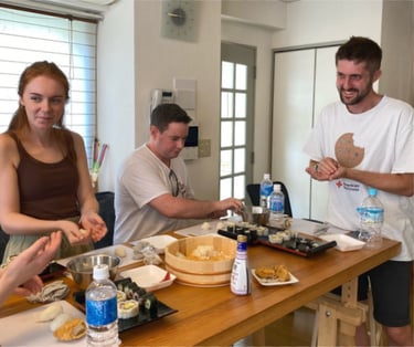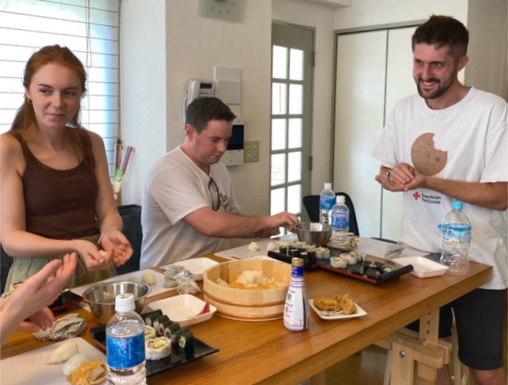 Now this is the morning after the night before! The group got in fairly late last night and in my ultimate wisdom I decided to have a shower before bed, so I could sleep in a little later and avoid the rush in the morning. However, in that ultimate wisdom I locked myself out my room without a towel. After pacing back and forth for quite a while, wet in my boxers, debating with myself whether I should wake people up, I finally got cold enough to knock on my room door at about 5am. Amanda, thankfully, is a good roommate and let me in. Although she does make me knock twice, letting me suffer a little longer then necessary. So unsurprisingly, I am in no rush this morning and wait until as late as possible to wake up for the day and, surprisingly, I feel fine. I am definitely still a little drunk. The activity this morning is a Sushi making class, the favourite of non-fish eaters all around the world. I joke, but it was actually a really great experience. I even try and share my thoughts on the flavour of umami to everyone, by describing it as earthy about 20 times which quickly becomes a running joke. I was sat with Ashley, Katie and Stephen. I was actually riding really high until about five minutes before the end, and then my hangover kicked in. After spending quite a while doing everything I could to make my sushi look as good as possible, I could not bring myself to eat it. However, Rachel picked me for third place for best looking. Although this was clearly out of pity, I will take it. Ashley won and to be honest I have to agree, hers did look impeccable. So it turns out fish and I don’t mix well, especially when I am hungover, who knew?