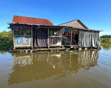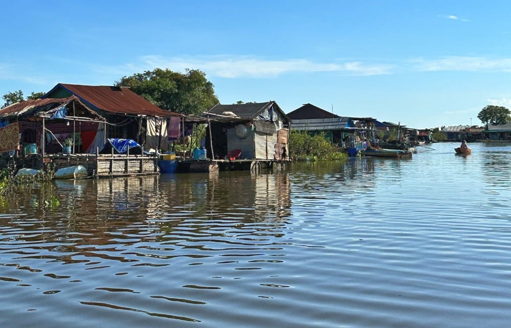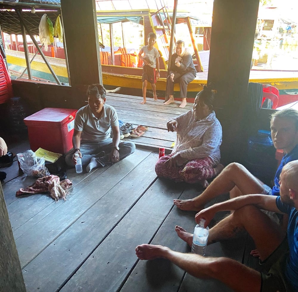 I wake up the next day late and a little sad, now you may be thinking well yeah that’s because your hungover Tom, well no actually it’s because its the final full day the group have together. Tomorrow we split, although the boys and I have some fun plans so not all hope is lost. I wake up and join some of the group on yet another bus to yet another boat. We are visiting Chong Kneas floating village on Tonlé Sap lake; it is a lovely day. The bus journey isn’t too long and the boat lets us sit on the roof and take in the sun, I love being on boats, the sound of the water and the smell, while one lays back relaxes and watches the world go by. Soon enough we start to see floating houses docked to the bank of the river. We work our way through the village eventually pulling up to a house and all of us unload. We find a kind woman, who has lived her whole life as part of this village, and her grandson waiting. We sit with drinks and snacks as the our guide translates her story and we have the option to ask questions. It is a simple life, most of the village fish for a living, the kids all in the same school and no one has much money. The village itself moves once a year with the seasons up river, a building at a time, which is pulled along floating on empty barrels. The buildings all look similar to a shelter one sees in the movies built by someone deserted on an island.