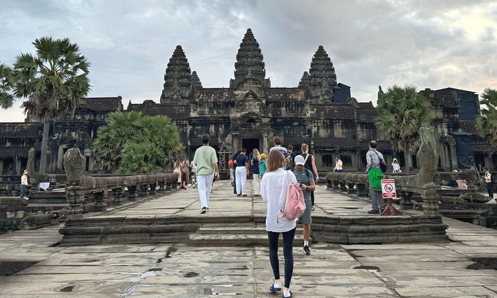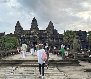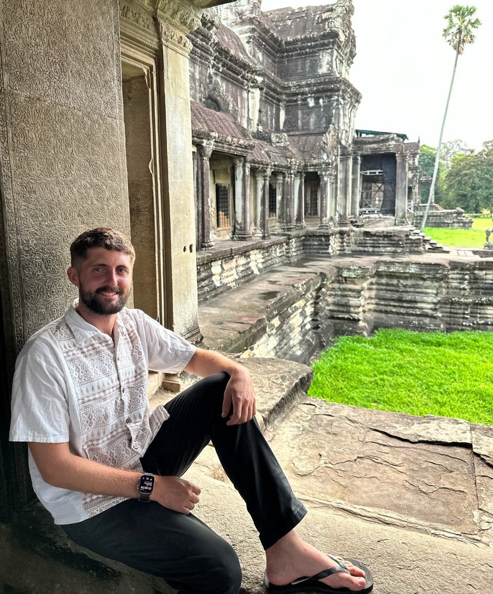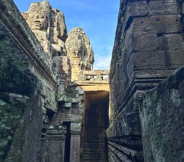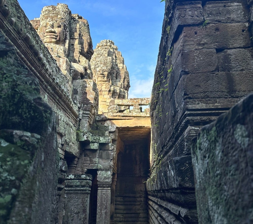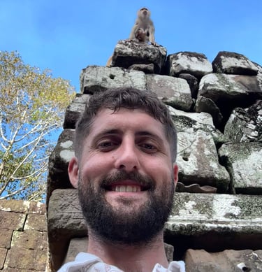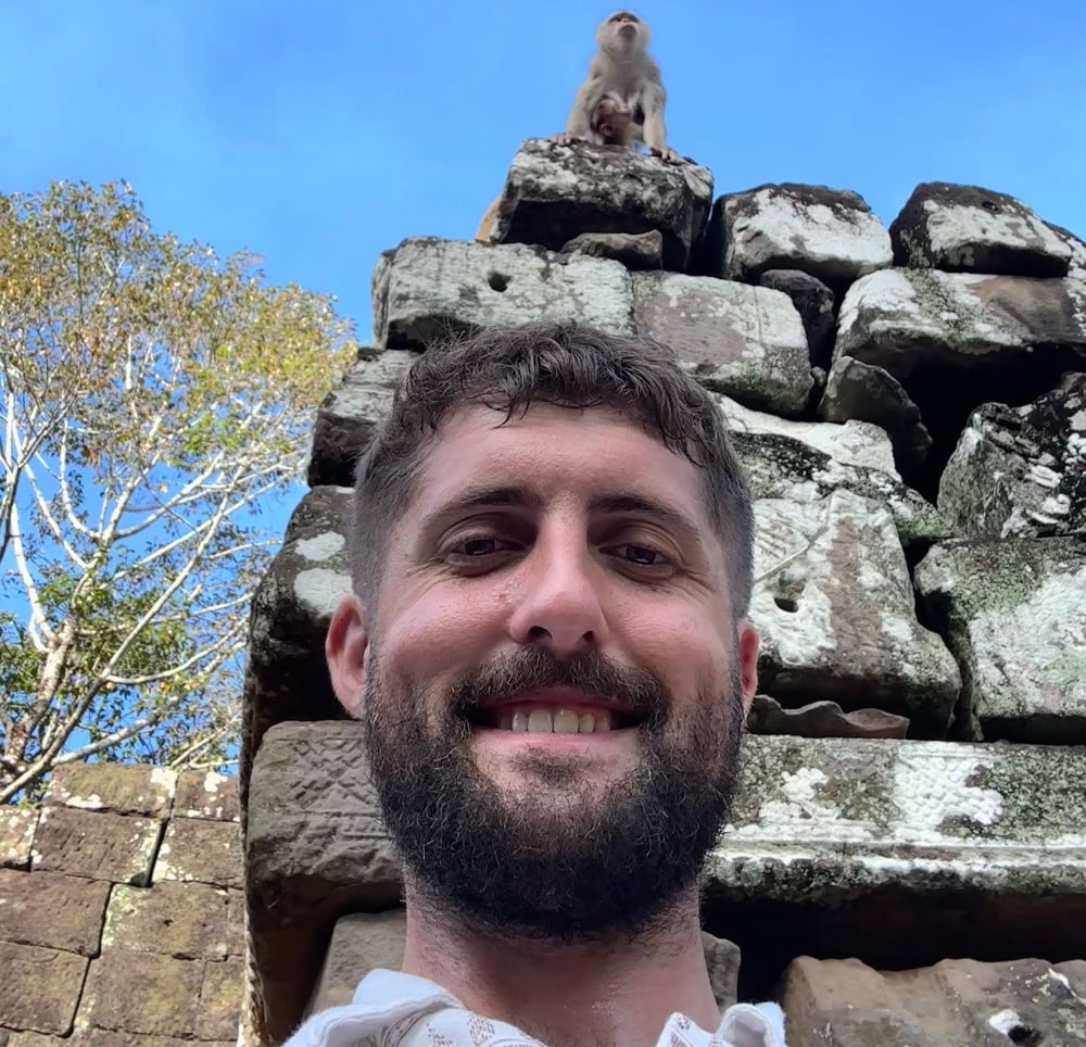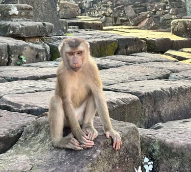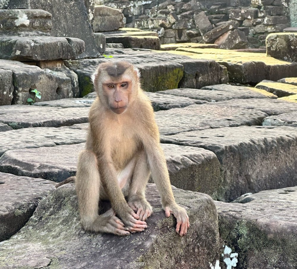 The early night was a good thing as we are up at 4:30am heading to Angkor Wat for sunrise. So up early and still foggy we load onto another bus. Angkor Wat is a temple complex located on a site measuring 162.6 hectares. Considered the largest religious structure in the world, it was built by the Khmer King Suryavarman II in the 12th century as his state temple and eventual mausoleum. To be honest I find the sunrise rather shite; it is cloudy and we can’t really see the sun and the so called viewpoint isn’t that good a view of the temple grounds. Nonetheless the tour of the temple itself is pretty good. The carvings of the gods into the stone, the sheer size of the complex and Alex’s excitement (he has wanted to come here since he can remember) makes it a pretty awesome experience. After Ankor Wat we head to another local temple, Bayon Temple, also known as monkey temple which, you guessed it, is over run with monkeys. They are steal-your-phone and jump-on-you type monkeys. It is another cool experience although I do at one point lose the group and get myself completely disorientated just searching the place for the group, luckily managing to find them just as everyone is leaving.
