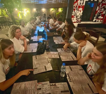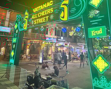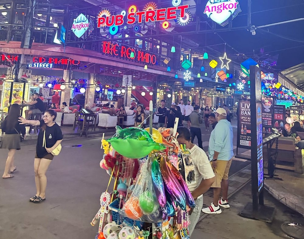 After the village we head back to the hostel and the group goes out for a final meal together, I order about three main dishes as I haven’t eaten all day and enjoy them all, to be fair I do share one of them with India so its not that bad. The food is so nice some of us decide to order sandwiches for our bus ride tomorrow back to Bangkok. I end up walking back with Elain, Charlotte and Louis. Elain and I have a nice chat about her plans, she is doing something similar to me, a work holiday Visa but in New Zealand instead of Australia, so are Zara and Lydia, they all plan to meet up. Once back at the hostel the plan was to go to bed but Jon, Poppy, Lars, Scott and I end up having a few drinks with friends we made last night and end up joining them back on a night out on Beer Street, where we had our pub crawl. It may have been me pushing for a night out but, hey, it is our last night in Siem Reap and on the tour, so why not.