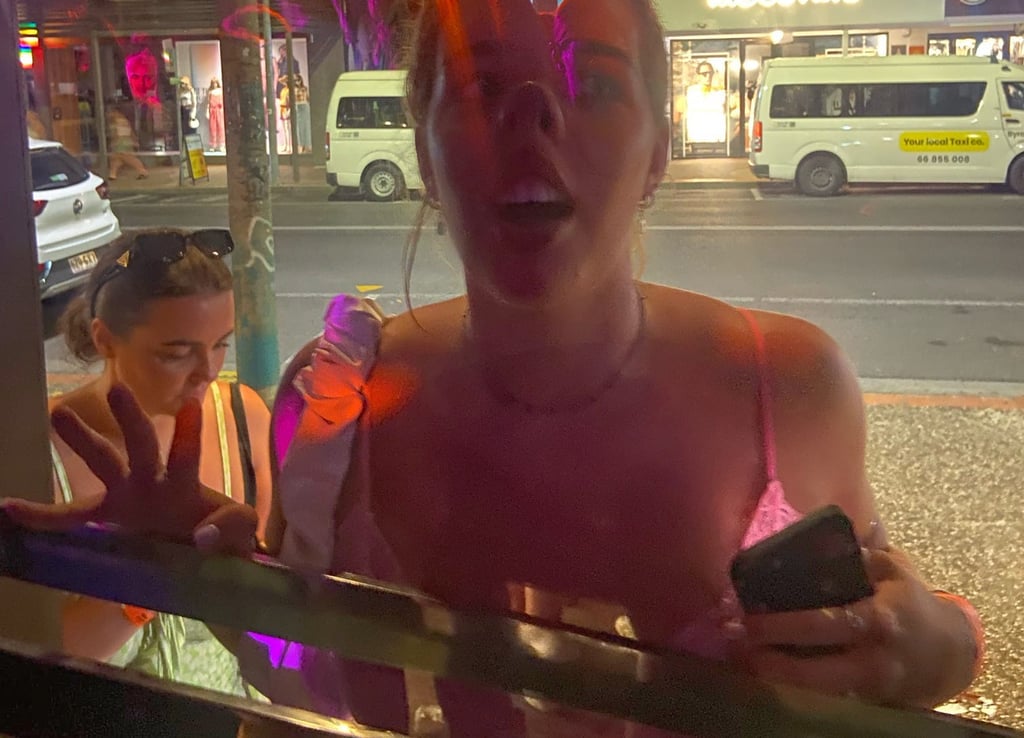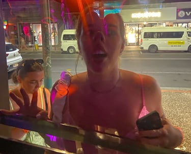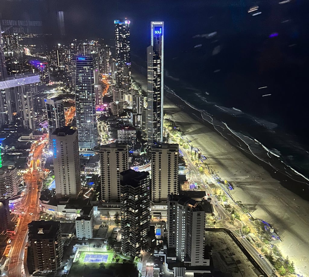 The next day I woke up after a lie-in feeling a little better but with what I believe is a reasonable distaste for Surfers’ Paradise in my mouth. Good thing about a lie-in is that I wake up in time for the group lunch we are heading to. It is exactly what I need, a combination of great Italian food and incredibly weird but extremely amusing conversation where no topic seemed to be off limits and a crazy number of, ‘what ifs’ and ‘would you choose this or that’ type questions were fired across the table. I spend the rest of the afternoon chilling around the hostel. Later Charlie, Beth and I head to the Sky Point for some amazing views of the city by night. I can’t help but be a little disappointed by the design of the view point, the glass is extremely reflective as glass tends to be and so it seems silly to me to the cover the whole area in very bright harsh lights making it impossible to see the view unless one smushes their face against the glass like a child or a drunk, as Alex did the other night at the kebab place (see picture). After a quick cocktail in the sky we head back to the hostel and I decide that after the events of the previous night I am just gonna have an early one and head off to bed.