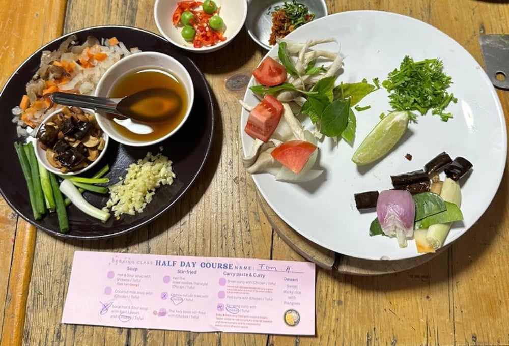 Once we had all settled in it was off to a cooking class. Not everyone chose to do the class but enough of us to require us to be split into two groups, mine consisting of me, the boys, Lars and Lesha. It was nice to be in a group as we got to choose a few different things to make and therefore taste a few different dishes! But before any of that we get taken to a local market to have a wander round and get tested on a few different ingredients. I did pretty well, naming quite a few, even if I do say so myself, but I was also impressed by Alex’s herb and veggie knowledge, although I probably shouldn’t be as I know we both share a passion for food and cooking. So after the market and a chance to have a wander round some fresh food and veg it is back in the car to the cooking school. Each person made four dishes I personally chose Pad Thai, stir-fried chicken with cashew nuts, a Thai red curry and everyone did sticky rice with mango for desert. It was a fun lesson and very informative, incorporated into different sections of prep, cooking and, of course, eating. It was great being able to try all the other dishes people cooked including green curries, panang curry, hot and sour soup and more. It was also nice to wash it down with a cold beer: after all there’s not much better than sharing a beer with new and old friends with a meal you’ve cooked yourselves.