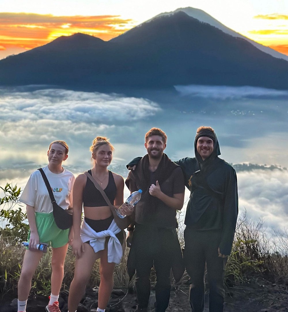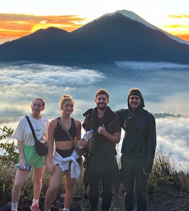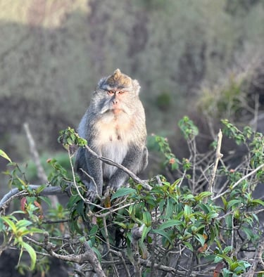 Funnily enough it is so early that this hike is at the same time as some of my friends back home are having a Christmas zoom, so I jump in and show them the view. We sit at the top and enjoy some snacks and a tea or two before stopping for some photos and then looking in and around the crater. Being an active volcano Mount Batur worries me a little, having read a recent news story about some campers that sadly died when a Balinese volcano erupted. Luckily that doesn’t happen here. Once the sun has risen and photos taken we start our hike down; we take a slightly different route this time. Many of us find it harder going down with a few, including me, slipping at times, unlike the sure-footed Long-tailed Macaque we meet on the way. We also find ourselves getting attacked by mossies which leads to one of the guides giving Mazie a branch to swat them away; this leads to some funny dance style swatting. At the bottom of the mountain we pass some cool farms that seem to be thriving on the rich, volcanic soils. One of the sprinklers overshoots into the road and we take turns standing under it, now that we are all sweating in the risen sun.
