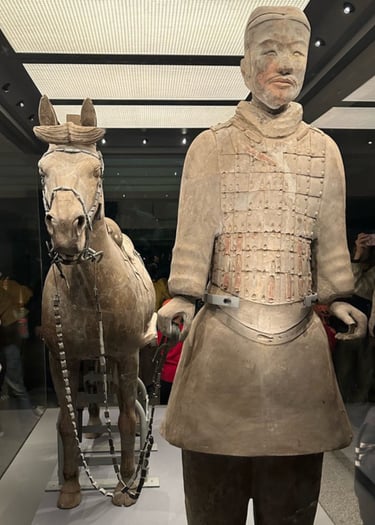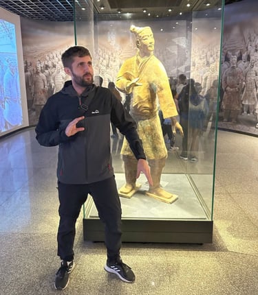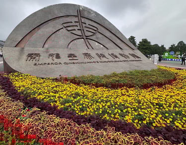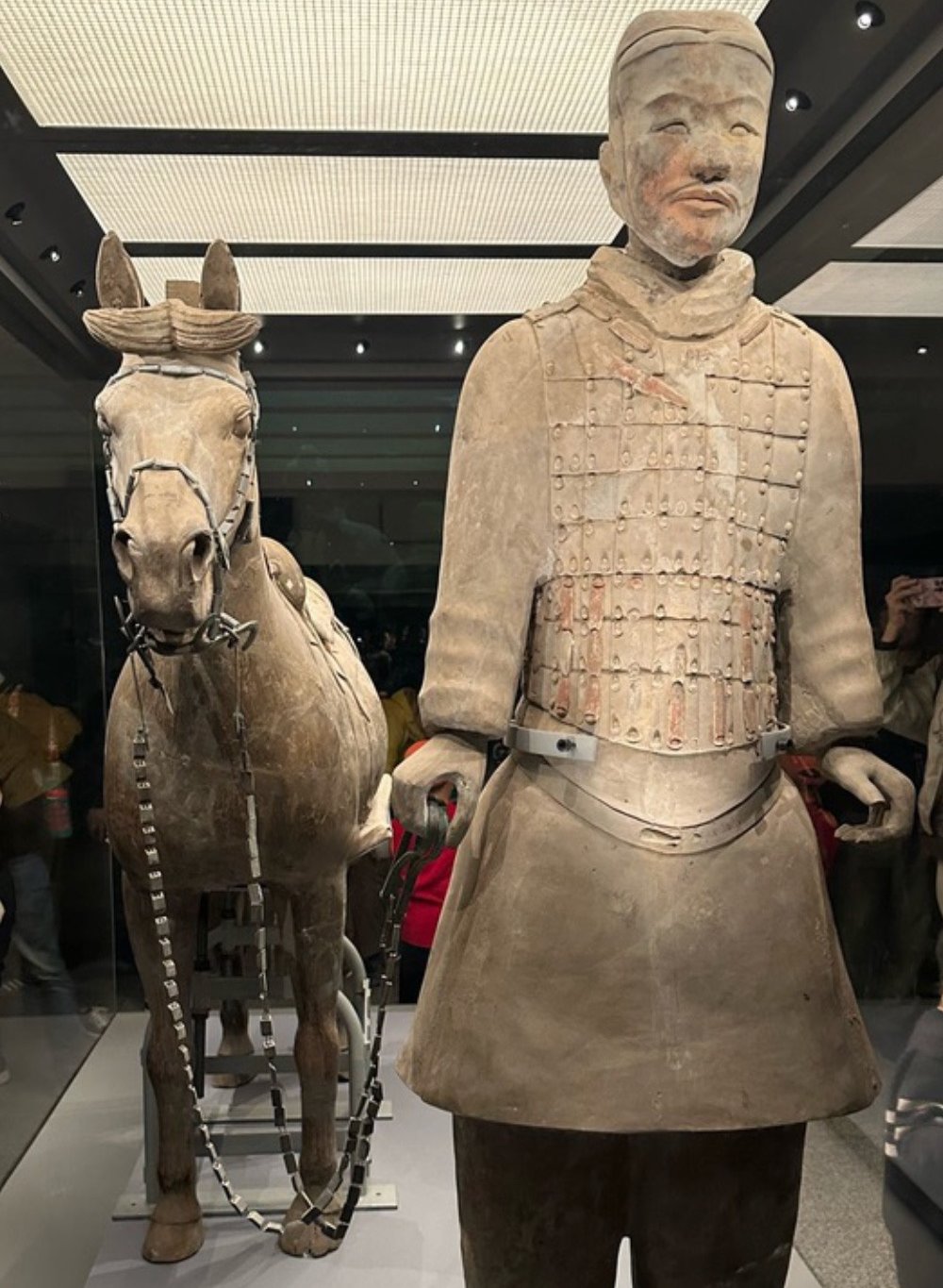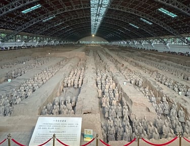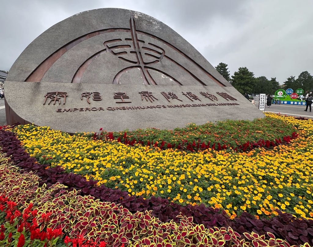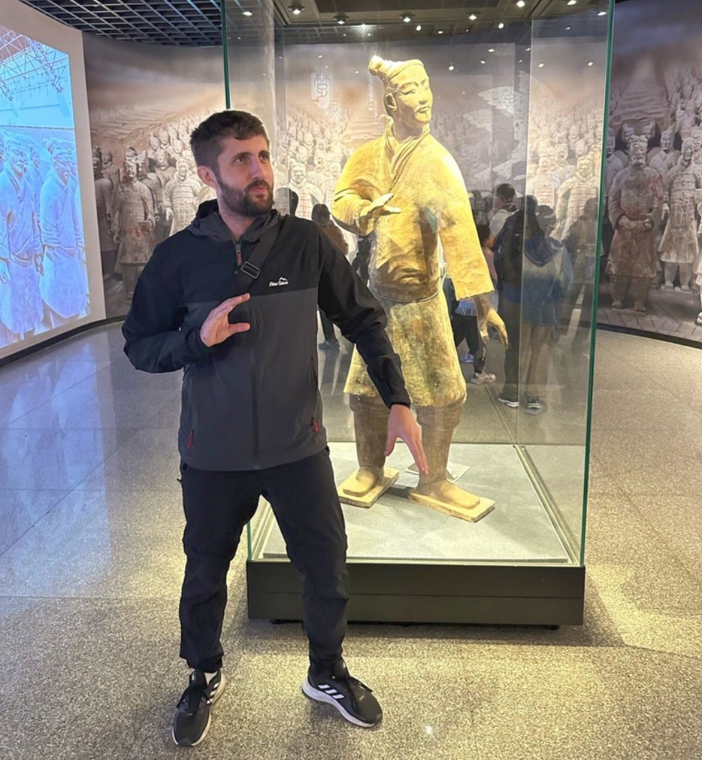 However, my excitement for a lie in is quickly trumped by my excitement for our plans for today. We are heading to the ancient mausoleum of Emperor Qin Shi Huang, the first Emperor of China. Qin Shi Huang is known for many things; he was the first ruler to unite the entirety of China under one banner, he ordered the start of the building of the Great Wall and, what we are seeing today, the Terracotta Warriors. After a quick train journey we find ourselves in a queue for the still active archaeological dig site. Technically we aren’t visiting the mausoleum itself but the four biggest pits that surround the burial site that house these ancient warriors. The burial site is surrounded by beautiful and lush hills and greenery, which used to be covered in farm lands. As we walk to the dig pits Sophia tells us that the tombs were lost to history for thousands of years, after the Emperor demanded the site be a secret to avoid grave diggers and potential destruction from enemies after his death.