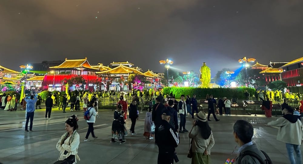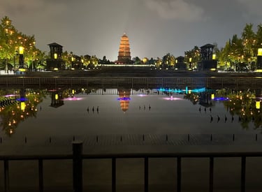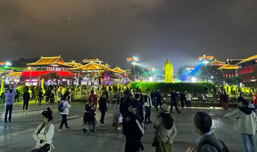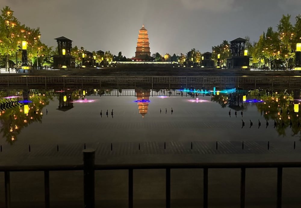 After the slightly disappointing meal we head out to the giant pagoda by ourselves for the highly recommended light show. We arrive just having missed the first showing but are determined to stick around for the second, so to kill the hour and a half we have to wait, we follow the crowds circulating around the massive park containing the fountains and pagoda where the light show is held. We go in search of a a desert. We quickly discover that the park, like a lot of places in China, has an arbitrary one way system with control zones and lines. This means we end up having to do two laps of the park after we fail to find a dessert the first time. Luckily though it gets us to the front of the fountains with plenty of time for the show, although the smell here is not pleasant, one of raw sewage – but we wait.